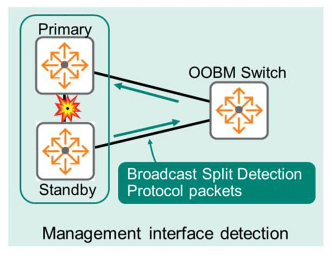 - Management Interface Split Detection (관리용 인터페이스 스플릿 탐지): 이 방법을 사용하려면 OOBM(Out-of-Band Management) 인터페이스를 기본(Primary) 및 보조(Secondary) 구성원에 연결해야 합니다. 이 인터페이스들은 모두 동일한 Layer 2 브로드캐스트 도메인(VLAN)에 있어야 합니다.
