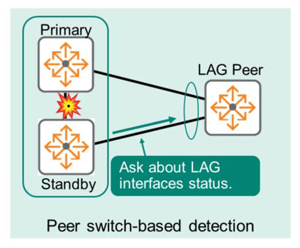 - Peer Switch-based Detection (피어 스위치 기반 탐지): 이 방법은 추가 연결이 필요하지 않으며, LAG(Link Aggregation Group) 구현에 의존합니다. 스위치는 LAG 피어에게 인터페이스 상태(기본 및 보조 스택(Primary and Secondary Stack)에 연결된 인터페이스)에 대해 확인합니다. LAG 피어가 기본 구성원이 연결된 인터페이스 상태가 정상이라면, 대기(Standby) 구성원은 스플릿 브레인 상태를 탐지하고 해당 인터페이스를 셧다운합니다.
