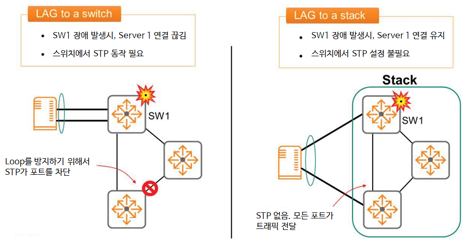 LAG와 스태킹 기능을 사용하면 네트워크에서 사용 가능한 모든 링크를 동시에 완전하게 사용할 수 있게 됩니다.