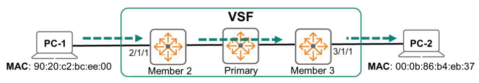 보내야 할 인터페이스가 다른 구성원에 있는 경우, 출발지 구성원은 VSF 링크를 통해 패킷을 전달합니다.