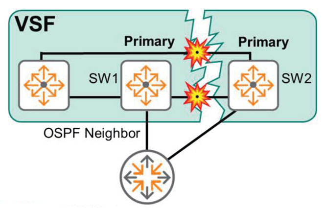 위의 그림은 링크 장애로 인해 조각난 VSF 스택을 보여줍니다. 원래 SW1은 Primary이고, SW2는 Secondary였습니다. 하지만, 조각난 이후에는 두 스위치 사이에 직접적인 연결이 없게 됩니다. SW1은 자기 스스로가 계속 Primary라고 인지하게 되고, SW2는 SW1과 통신이 되지 않기 때문에 이제 자신이 Primary라고 생각하게 됩니다.