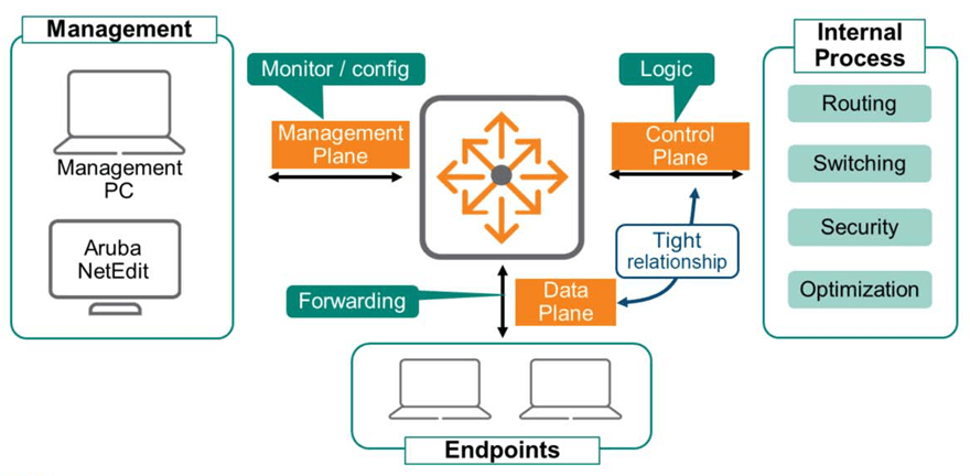 이러한 결정은 라우팅, 스위칭, 보안 또는 트래픽 최적화와 같은 내부 프로세스를 통해 이뤄집니다. 데이터 평면과 제어 평면은 가능한 한 빨리 모든 데이터를 처리하기 위해 서로 긴밀한 관계를 갖고 있습니다.