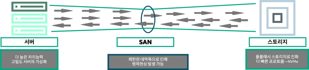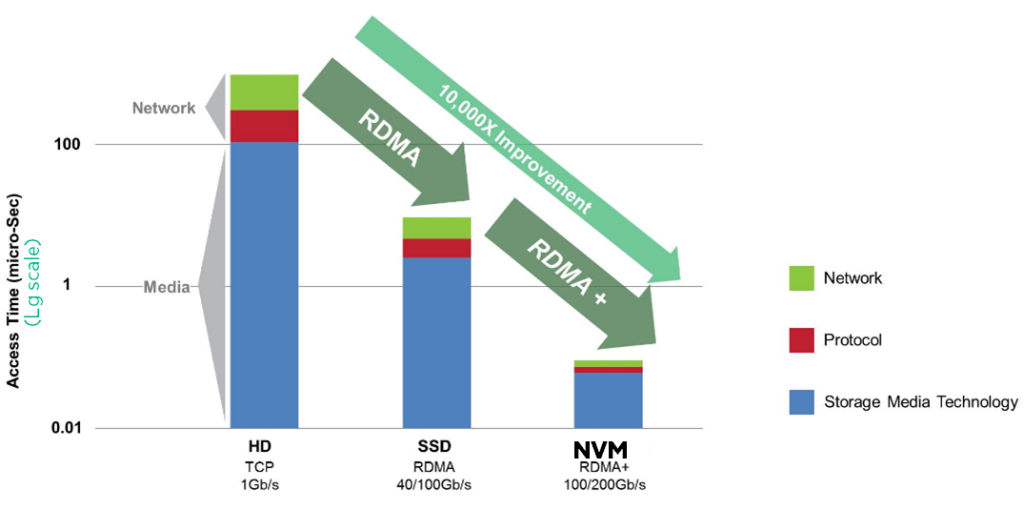 최근에는 차세대 서버의 개발, 서버 가상화의 증가, 플래시 기반 스토리지의 도입, NVMe와 같은 새로운 스토리지 기술의 도입으로 FC(Fiber Channel)과 같은 기존 스토리지 네트워킹 프로토콜의 성능을 뛰어넘는 읽기/쓰기 스토리지가 가능해졌습니다. 이제 SAN의 성능 병목 현상이 스토리지 미디어에서 네트워크로 이동했습니다.