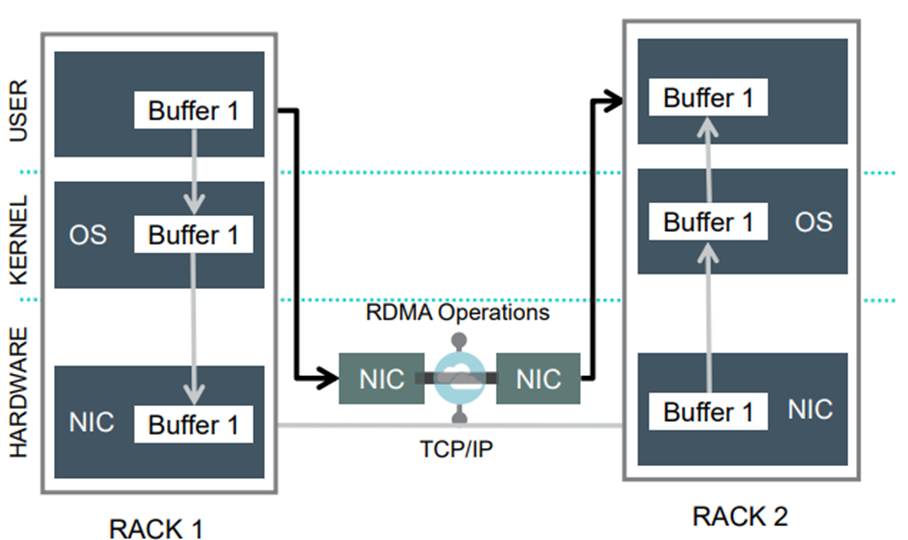 RDMA가 없다면, 애플리케이션은 가상 버퍼 공간에서 스택과 유선을 통해 데이터를 이동하기 OS에 의존해야 합니다.
