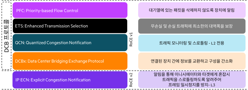 | QCN | Yes | No | 필수는 아니지만, multi-hop L2 RoCEv1에 권장 CN은 Pause Unfairness 및 Victim Flow 문제를 해결하는 데 도움 |
