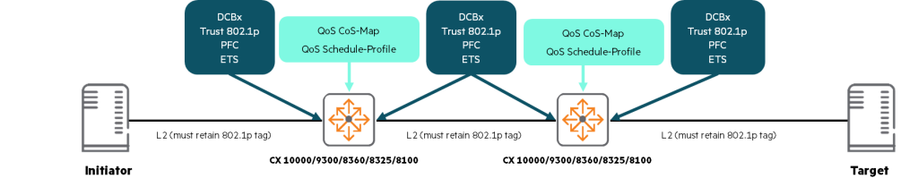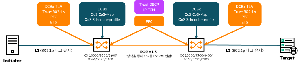 RoCE 기반 솔루션에서 호스트(Initiator 또는 Target)는 무손실 트래픽이 올바른 802.11p 또는 DSCP값으로 연결된 스위치로 전송되도록 구성됩니다. 패브릭의 스위치는 Initiator와 Target을 향하는 L2링크와 스위치간의 L3링크를 활용합니다.