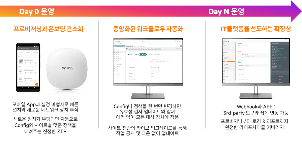 하지만 Aruba Central과 같은 클라우드 네트워킹 솔루션을 사용하면 IT 관리자가 단일 관리 콘솔에서 네트워크의 모든 디바이스를 원격으로 제어, 구성, 필요한 변경사항을 푸시할 수 있습니다. 이를 통해 네트워크 전반의 워크플로우를 자동화하고 오케스트레이션할 수 있으므로 장비 설치부터 모니터링까지의 운영을 획기적으로 간소화할 수 있습니다.