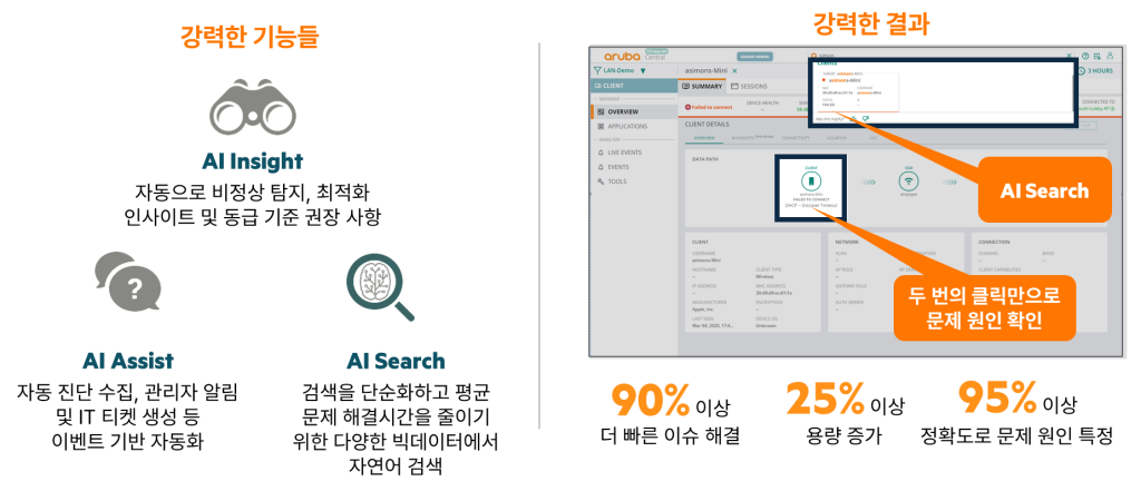 또한 모든 관련 진단이 미리 입력되어 반복되는 문제에 대해 Aruba TAC(기술지원센터)에 알릴 수 있습니다. - AI Search: Aruba Central 내 Data Lake의 자연어 처리 엔진입니다.