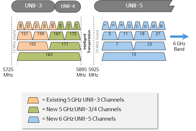 좀 더 넓은 공간이 있는 국가도 있지만, 일부 국가에서는 5Ghz 대역과 6Ghz 대역이 단 50Mhz 사이로 분리되어 있습니다.
