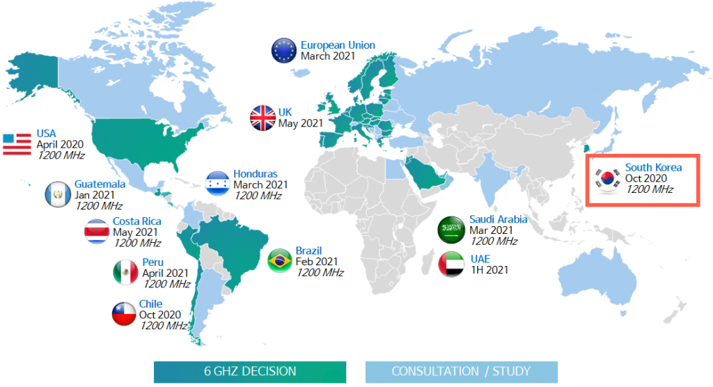 그림에서 보시는 것처럼 많은 국가에서 새로운 6Ghz 대역의 사용을 승인하고 검토하고 있습니다.