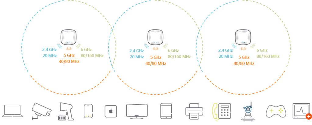 아루바는 2.4Ghz 대역은 20Mhz 채널로 IoT 단말과 같은 2.4Ghz 대역만 지원하는 단말이 연결되도록 하고, 5Ghz 대역은 80Mhz 채널로 설정하여 6개의 채널을 사용하도록 함으로써 6Ghz 대역을 지원하지 않는 일반적인 고성능 단말들이 연결되도록 합니다. 마지막으로 6Ghz 대역은 160Mhz 채널로 7개의 채널을 사용하여 최신의 장비들이 고속, 고성능으로 연결될 수 있도록 설계합니다.
