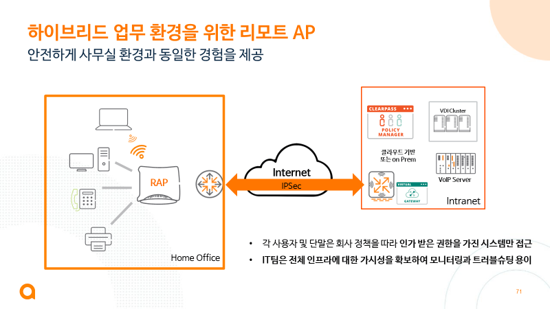 Aruba는 이 외에도 SD-Branch, VIA 또는 RAP 등을 포함하여 원격 접속을 제공하는 다양한 옵션을 제공합니다.