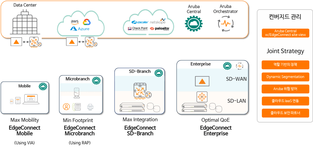 코로나19로 인해 이제는 다양한 환경, 위치에서 네트워크 접속을 요구하고 있습니다. 이를 위해서 Aruba는 요구사항에 맞는 SD-WAN 패브릭 솔루션을 제공하고 있으며, 이는 모두 Aruba VPNC(Controller) 또는 EdgeConnect 어플라이언스로 IPSec VPN 터널링 연결하고, 트래픽에 대한 가시성과 보안, 정책 자동화를 수행하도록 돕게 됩니다.