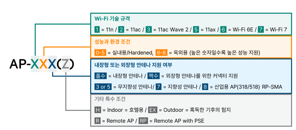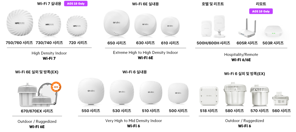 다양한 AP 모델들은 실내/실외, 원격/접객 환경 등 운영 환경의 차이뿐만 아니라, 성능과 용량 면에서도 다양한 수준을 제공하여 고객의 요구에 맞는 최적의 선택을 가능하게 합니다.