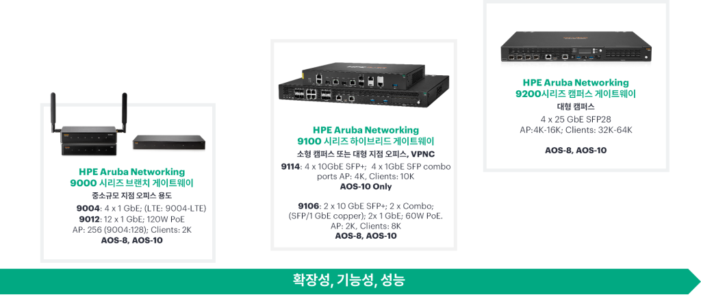 HPE Aruba Neworking은 확장성, 24×7 운영, 그리고 향상된 보안을 요구사항을 충족하기 위해 다양한 게이트웨이 옵션을 제공합니다.