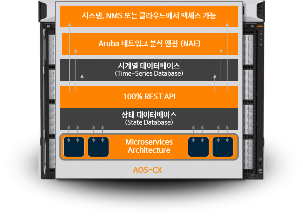 클라우드 네이티브 운영체제라고 불리우는 AOS-CX는 마이크로서비스 아키텍처를 사용하고 있습니다.