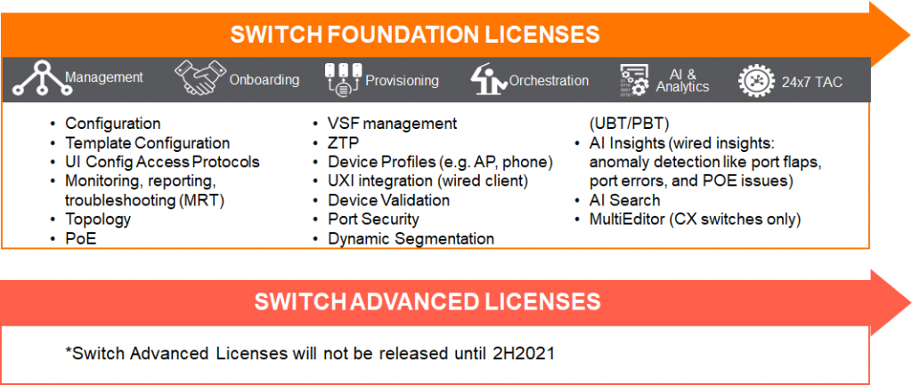 스위치는 아직 Advanced 라이선스가 없습니다. 스위치를 Central에 연동했을 때 현재 제공하는 모든 기능을 Foundation 라이선스로 사용할 수가 있습니다.