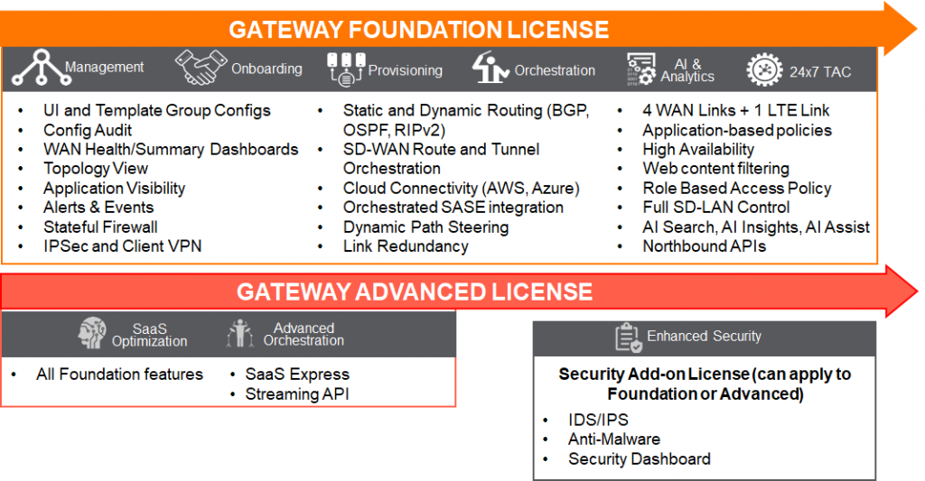 SD-Branch 게이트웨이 역시 대부분의 기능이 Foundation 라이선스에 포함됩니다.