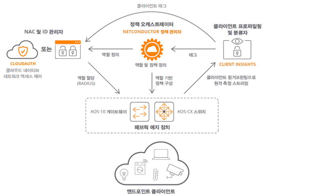 Aruba는 이미 ClearPass라는 강력한 네트워크 접근제어 솔루션을 갖고 있습니다. 다양한 네트워크 환경, 다양한 요구사항에 맞게 IP기반이 아닌 Role(역할)기반의 정책을 펼쳐 그 사용자에 맞는 인증과 인가를 수행합니다.