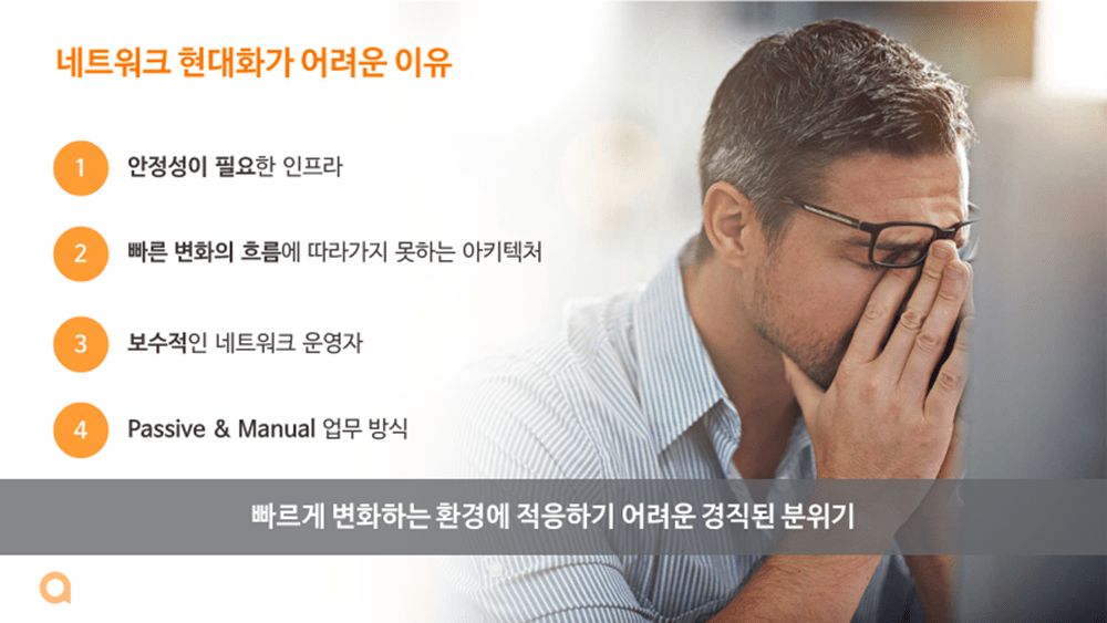 기존의 레거시 방식으로는 이러한 변화를 쫓아가고 따라갈 수 없게 되었습니다. 그렇기 때문에 우리는 이제 생각을 바꾸고 보다 최신의, 현대화된 네트워크 인프라가 필요해진 시점입니다.