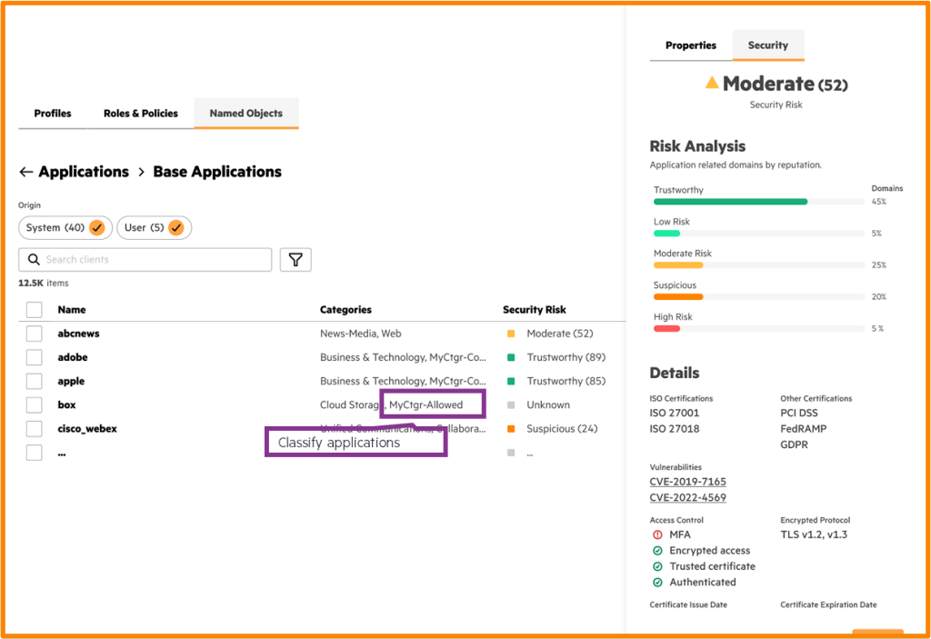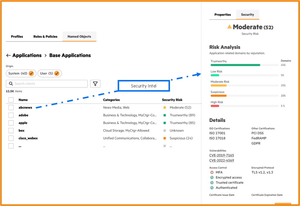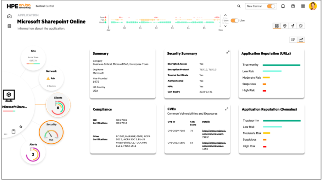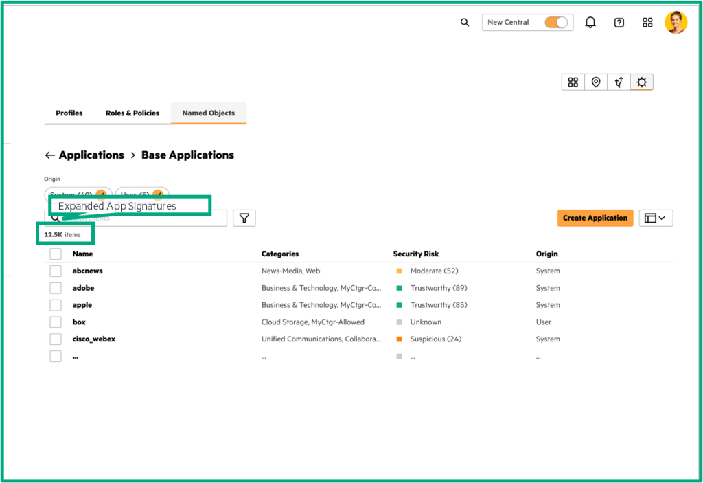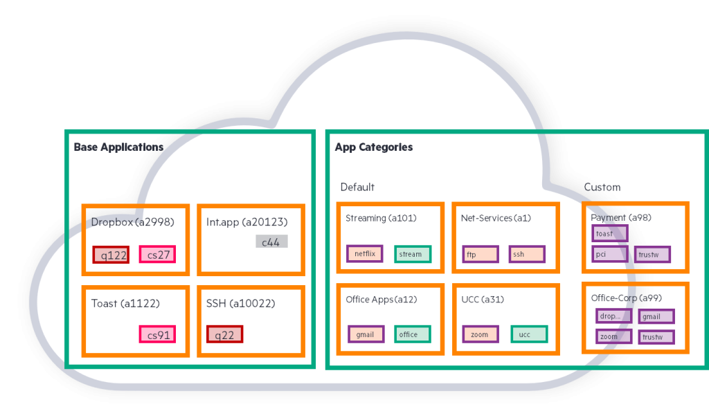 이 라이브러리는 상세한 카테고리와 위험 프로필을 포함하며, 이는 Central이 관리하는 액세스 포인트, 게이트웨이, 스위치와 같은 장치에 배포됩니다. 결과적으로 강력한 실시간 적용 엔진이 생성되어 관리자가 위험 기반, 제로 트러스트 적용을 자신 있게 적용할 수 있습니다.