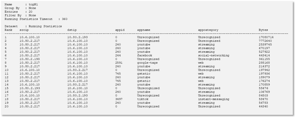 CLI에서도 show traffic-insight TI1 monitor-type topN-flows topN1 app-details 명령어를 통해 확인할 수 있습니다.