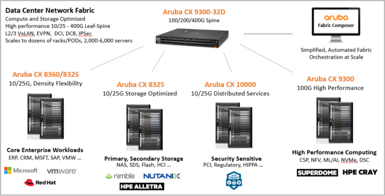 운영자는 또한 Aruba Fabric Composer(AFC)를 활용하여 점점 커지고 복잡해지는 네트워크 패브릭을 관리할 수 있습니다. Aruba Fabric Composer는 패브릭 언더레이부터 가상화 오버레이의 자동화, 오케스트레이션, 엔드-투-엔드 시각화를 크게 단순화하여 랙 규모의 컴퓨팅 및 스토리지 전반에 걸쳐 프로비저닝을 빠르게 할 수 있도록 도와줍니다.