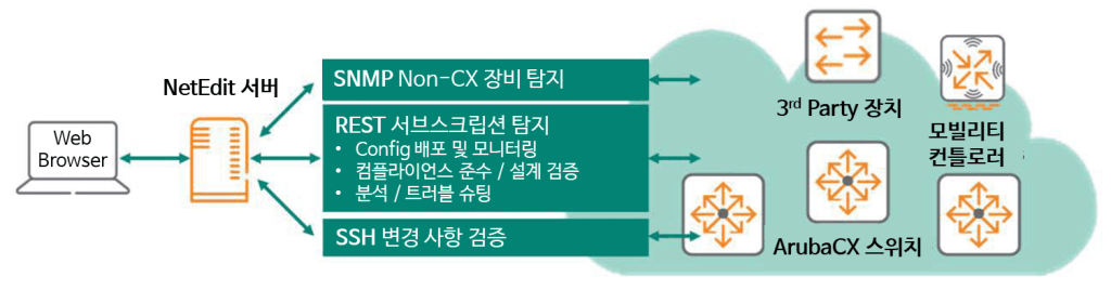 그 외에 변경사항 검증을 위해서 SSH를 사용하기도 하고, Non-CX 장치에 대한 검색을 위해서 SNMPv2c 및 SNMPv3를 지원하기도 합니다.