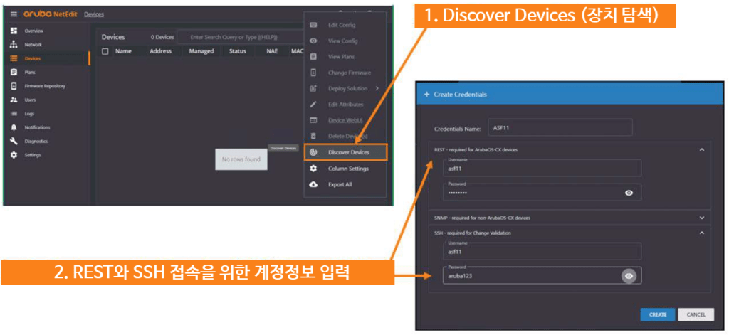 Aruba NetEdit로 장치를 검색하기 위해서는 다음과 같은 사항이 스위치마다 필요합니다.