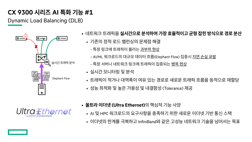 하지만 이러한 방식은 특정 링크에 트래픽이 몰려 과부하가 되거나 AI 워크로드에서 대규모 트래픽이 발생해서 특정 링크에 집중되었을때 분산 시킬수가 없습니다. 그렇기 때문에 DLB라고 하는 이 기능은 AI 패브릭과 같은 고대역폭 네트워크에서 급변하는 트래픽 환경에 능동적으로 대응하여 네트워크 자원을 효율적으로 사용하고, 병목 현상을 방지하며, 전반적인 시스템 성능을 최적화하는 데 핵심적인 역할을 하는 기능입니다.